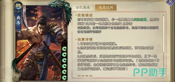 典韦的第二个技能叫做逐虎过涧,它允许典韦在特定条件下与其他角色交换位置并对附近的角色造成伤害,这个技能使用的时候大家可以选择弃置一张武器牌,然后指定一名其他角色,与该角色交换位置,交换位置后,你对此时距离你1以内的一名其他角色造成1点伤害,但是这个技能的发动需要满足一定的条件,一旦成功触发战术优势还是不错的。