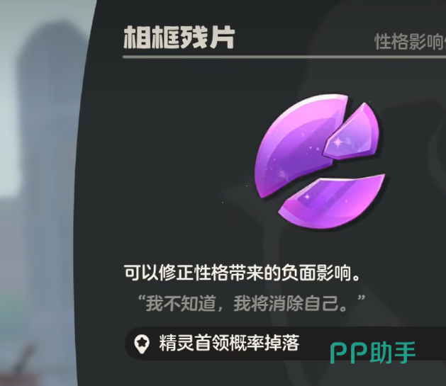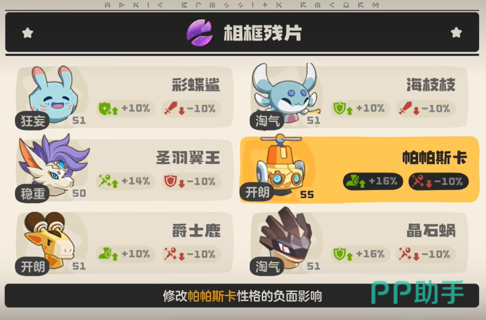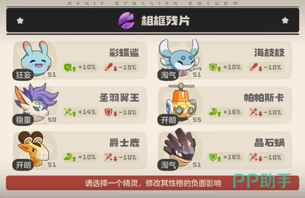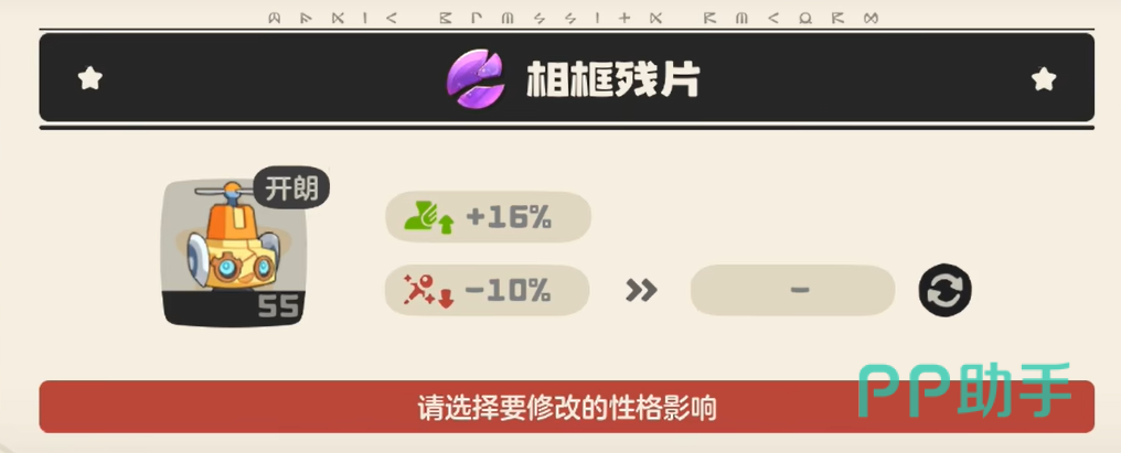 核心道具名为“相框残片”,专用于性格微调。需特别注意:该道具仅能变更性格中“被削弱的属性”(即减益项),无法改动“获得加成的属性”(即增益项)。举例说明——若目标精灵当前为“谦让”性格(+魔攻,−物攻),使用相框残片后可将“−物攻”改为“−速度”或“−防御”等其他减益项,但“+魔攻”部分不可更改为“+物攻”。因此,若需达成“固执”(+物攻,−魔攻)效果,必须先获取具备“+物攻”基础加成的性格个体,再通过相框残片将减益端定向调整至魔攻属性上。