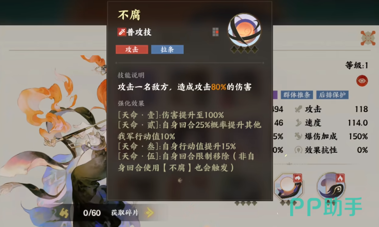 这一共有三个强力的技能可以使用,首先一个技能名叫不腐,使用这个技能之后,如果攻击对方阵营中的成员,可以直接带来80%的伤害,在强化之后能让伤害提升到100%,另外在提升了第2级之后,每次回合对战的过程中,有25%的概率,可以直接提升自身队伍的行动值。