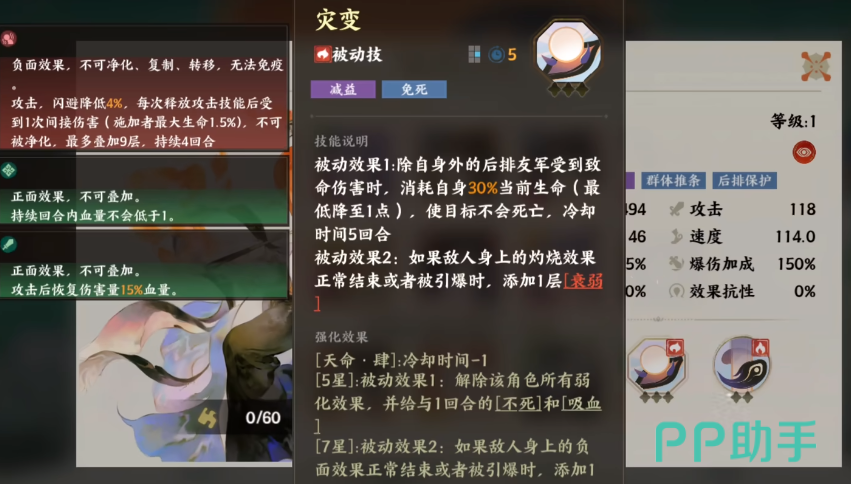 角色的第二个技能名叫灾变,这是一个被动技能,除了角色自身之外,如果有其他的后排成员受到伤害,那么角色就会直接消耗自身30%的生命,让队伍里的其他成员不会死亡,但这个技能一旦使用过后,需要冷却5个回合才能继续使用,另外的一个被动效果就是,在对手受到灼烧效果之后,还会给对方添加一层衰弱。