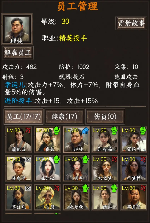 这类职业的员工都有一个特性那就是依靠体力值来增加攻击伤害,像这种坦克型的输出角色在这种末日的环境下也是非常吃香的,而且容错率也非常高,就算放在前排也丝毫不用担心,还能够起到保护队友的效果。
