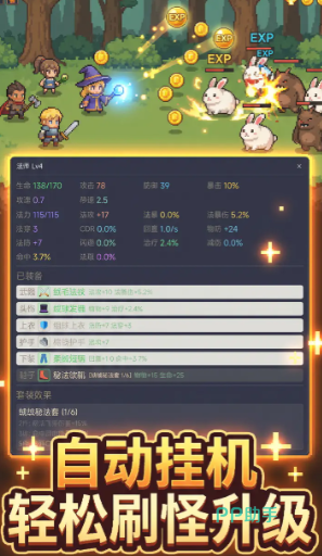 装备掉落机制经过平衡优化,基础品质获取顺畅,稀有词条装备亦具备可观出现概率,为长期挂机增添持续正向反馈。伙伴系统支持自由组合,每位伙伴拥有差异化技能定位(如护盾型、爆发型、治疗型),玩家可根据副本特性灵活配置阵容,显著提升清怪效率。美术风格延续明亮清新的卡通基调,摒弃压抑暗黑元素;从新手村的木质栅栏到秘境森林的荧光蘑菇,整体配色明快柔和;怪物形象圆润可爱,战斗特效简洁克制,长时间游玩无视觉压迫感,有效缓解用眼疲劳。