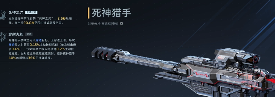 死神猎手则更侧重单体持续输出稳定性。其基础射速与后坐力控制优秀,即使未激活主动技能“死神之光”,也能维持较高DPS节奏,在对抗高血量首领单位时反馈清晰、容错率高。但该武器存在明显短板:群体作战效能偏低,尤其在技能真空期缺乏范围压制手段,需配合队友控场或依赖特定插件补足AOE能力,更适合双人协作或小队固定阵容使用。