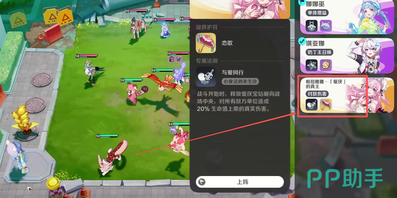 在装备选择方面,推荐搭配帕帕雅雅这一角色。她所持有的恋歌护符不仅具备专属法则“与爱同行”,还能在战斗初始阶段投掷一枚特殊宝钻,对敌方全体造成相当于其最大生命值20%的真实伤害,具备强力的先手压制力。