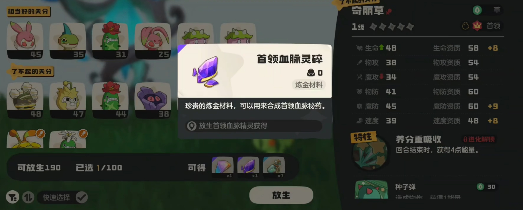 要想制作首领血脉秘药,得先拥有它的配方。配方解锁的方法很简单,各位只需将自己不需要的首领精灵放生掉,就能完成该配方的解锁了。同时,每次进行首领精灵的放生,各位还能拿到合成首领血脉秘药必备的道具首领血脉灵碎,但要注意每只首领精灵智能提供一个首领血脉灵碎。