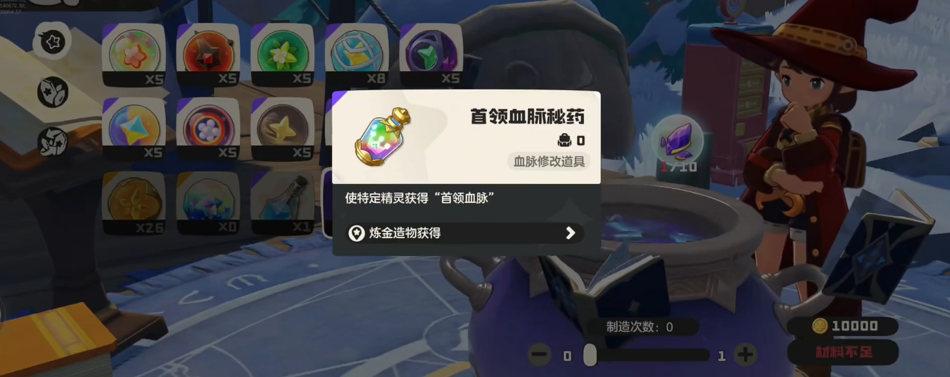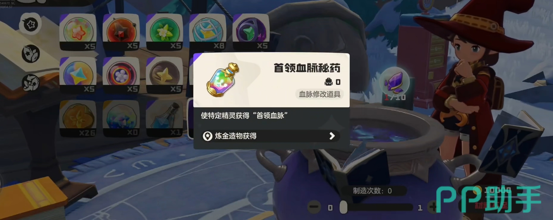 完成首领血脉秘药配方的解锁后,各位就能与任意炼金釜交互,并选择炼金造物功能,然后便可在秘药一栏里找到合成首领血脉秘药的选项里。目前,首领血脉秘药需要10各首领血脉灵碎作为材料,这也意味着玩家们至少需要放生10只首领精灵,才能合出一瓶首领血脉秘药,可见该秘药的宝贵。