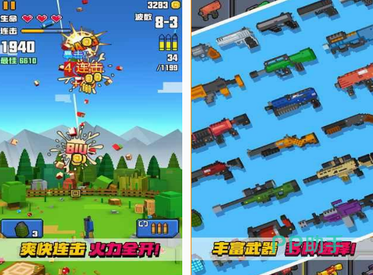 这是以非常简单的射击玩法为主的,整体的风格采用的是像素这种设计,收录了超过40多种枪械,通过收集以及使用的方式,帮助你在挑战的时候,获得不错的成绩。更有40多种物品,你能通过击碎或者收集的方式,帮助自己在游戏的过程中更顺利。一共有三种模式,大家可自由选择,包括街机、经典,以及飞碟,需要通过活力全开,与对手进行教练。