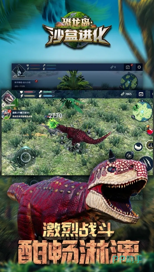 这部游戏可让人们在击败其它恐龙后,将它们转化为自己进化所需的一起物资,不断地完成物种进化,并成为这座沙盒岛上食物链的顶端。游戏有着极其刺激的玩法,每次与其它恐龙战斗都能让各位获得一种很不错的热血感,而且它里面的恐龙类型也较为丰富,能进化成的恐龙也比较多,例如霸王龙等,各位可去试玩一下。