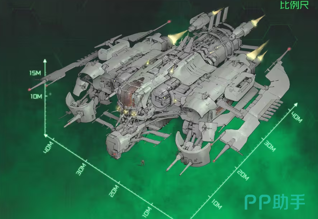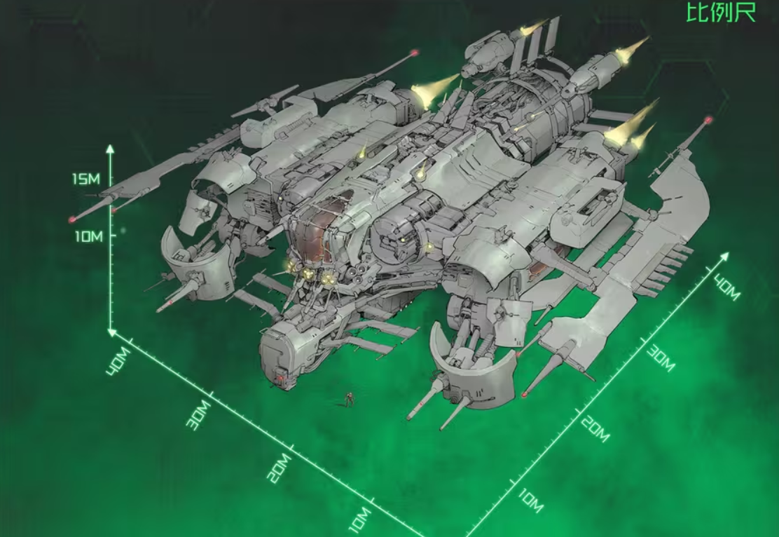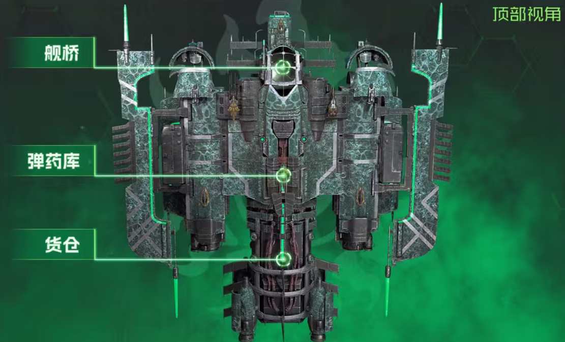 舰体采用三段式模块化设计:中央舱段集中布置主能源核心、弹药储备库与指挥中枢,保障火力持续投送效率;两侧翼下空间内置辅助燃料槽与等离子储能环,支撑长时间高强度作战;所有主武器弹药通道均经顶部凝金鳞甲结构进行物理封装与能量耦合,确保供弹稳定性与抗毁性。