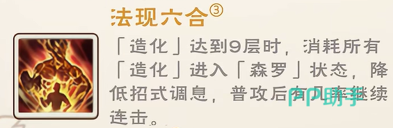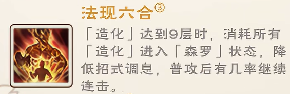 第三式「法现六合」需消耗全部造化(满9层)方可激活,触发后进入「森罗」状态:技能调息时间缩短,且普攻命中后有一定几率追加一次额外打击。此状态强化持续压制能力,适用于快速清杂兵或压低Boss血线。