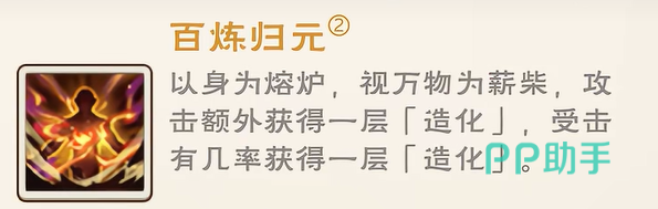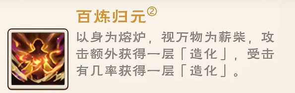 次式「百炼归元」属被动协同技,无独立施放动作。每次成功打出普攻或受到敌方攻击时,均有概率额外获得1层造化。该机制显著提升资源获取稳定性,尤其在拉锯战或被压制场景下,可维持造化存量,避免断档。