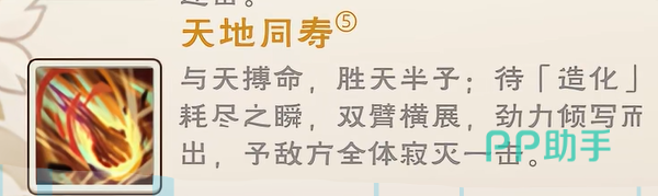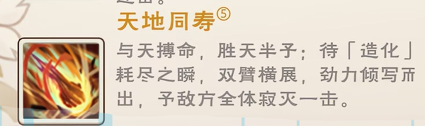 终式「天地同寿」为终结技,触发条件为造化层数归零瞬间。发动后对全体敌方单位释放一次高倍率「寂灭一击」,伤害总量可观,具备显著的团战收割价值。该技将前期积累的能量彻底转化为范围爆发,完成从量变到质变的战术收束。