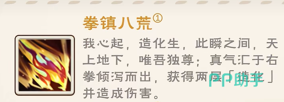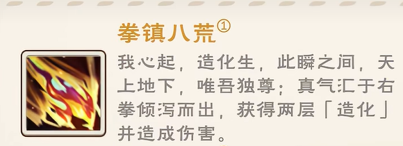 首式「拳镇八荒」为单体起手技,命中目标后造成基础伤害,并稳定赋予2层造化。此招冷却短、发动快,是常规对战中最可靠的造化来源,亦为后续连招铺垫基础。