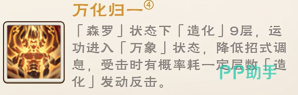 第四式「万化归一」同样要求造化达9层方可触发,但效果路径迥异:激活后进入「万象」状态,除降低技能调息外,更赋予受击反击机制——当角色被攻击时,有概率自动消耗若干造化层数,对攻击者实施一次即时反制。该设计大幅提升中近距离缠斗中的反打效率与战术弹性。
