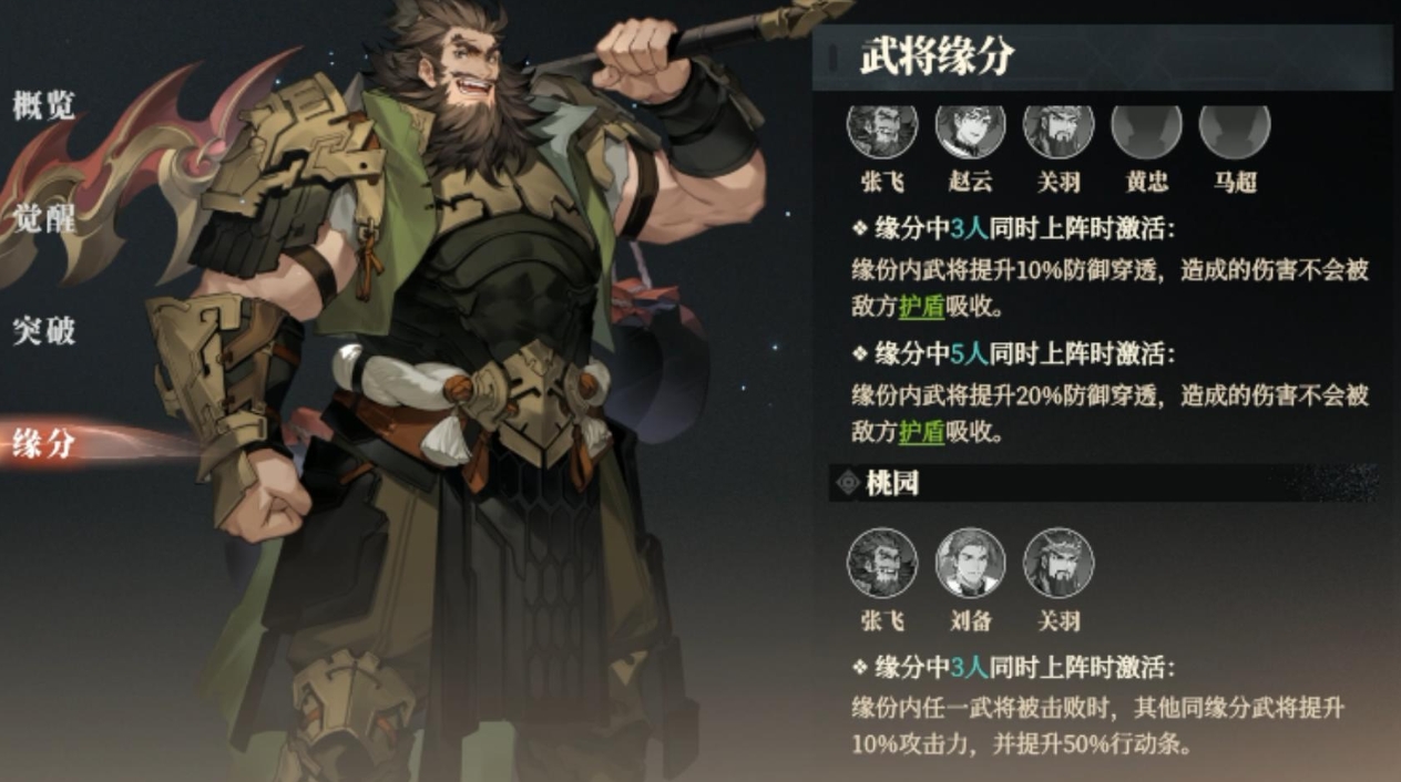 蜀国桃源队的核心成员无疑是张飞、刘备以及关羽这三位传奇武将,当这三位武将齐聚一堂时,便能触发一种特殊的武将羁绊效果,这个羁绊堪称强力,它能够为整个队伍带来10%的物理穿透属性加成,更为关键的是本次攻击将不会被任何护盾所吸收,这一特性使得该阵容在面对以护盾为主的敌方阵容时,拥有极强的克制能力,其强大的穿透效果足以轻易穿破敌方高额的防御,让队伍在战斗中展现出凶猛的攻击态势,是一支擅长猛攻的队伍。