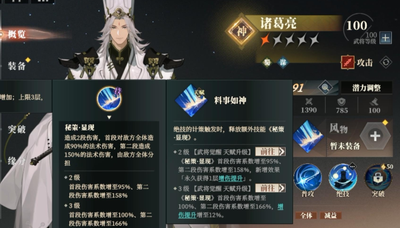 诸葛亮的优势在于其范围伤害技能十分出色,此外他的技能还附带额外的控制效果,可以牵制对面,加成效果也是蜀国其他武将更高,进一步提升队伍的整体实力,所以目前对于蜀国桃源队的上阵武将小编有着明确的建议,初期可以选择刘备、关羽、张飞、诸葛亮和赵云这五位一星武将作为上阵阵容。