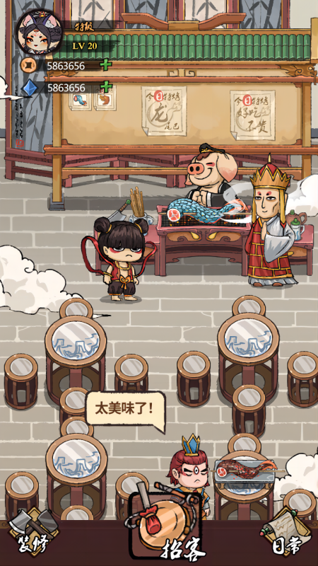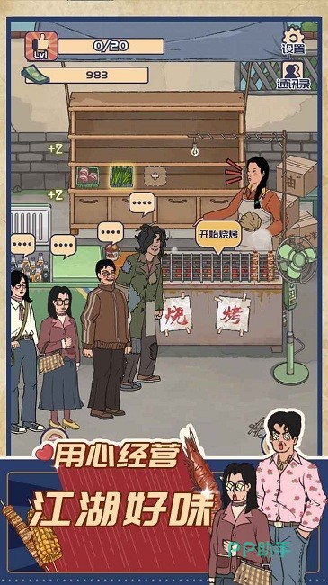 整个游戏带有一种非常复古的风格,是大家之前在语文课本上所见过的人物形象。玩家作为老板需要管理好自己的烧烤摊位,可以通过招募店员师傅,来增加店铺的制作速度。同时玩家还可以去提升这些装备的等级,大家的操作也是比较简单的,只需要点击客人头上方的购物栏,就可以满足他们的订单需求了。