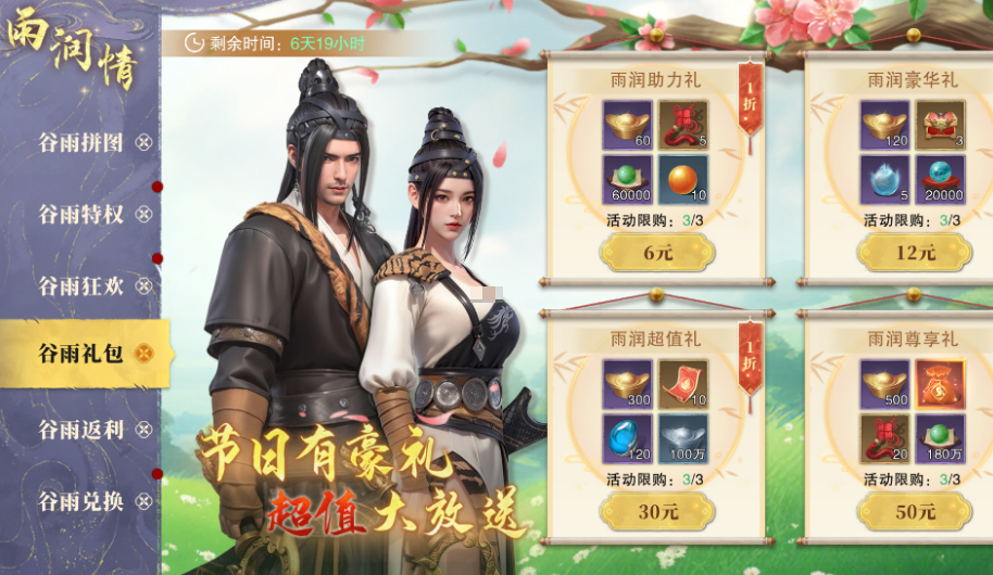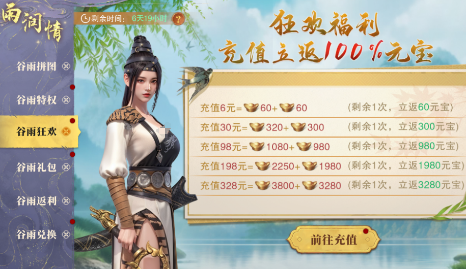 对于喜欢充值的玩家,谷雨狂欢活动为你提供了充值返还的机会。在活动期间,只要充值达到指定金额,即可获得等额元宝返还。这是一次难得的充值福利,不仅能加速你角色的成长,还能通过返还元宝提升你的实力。