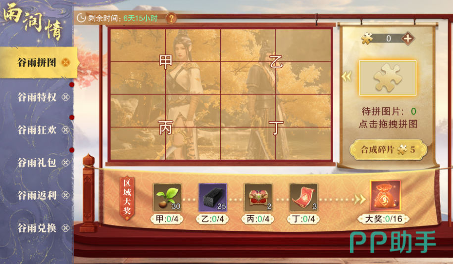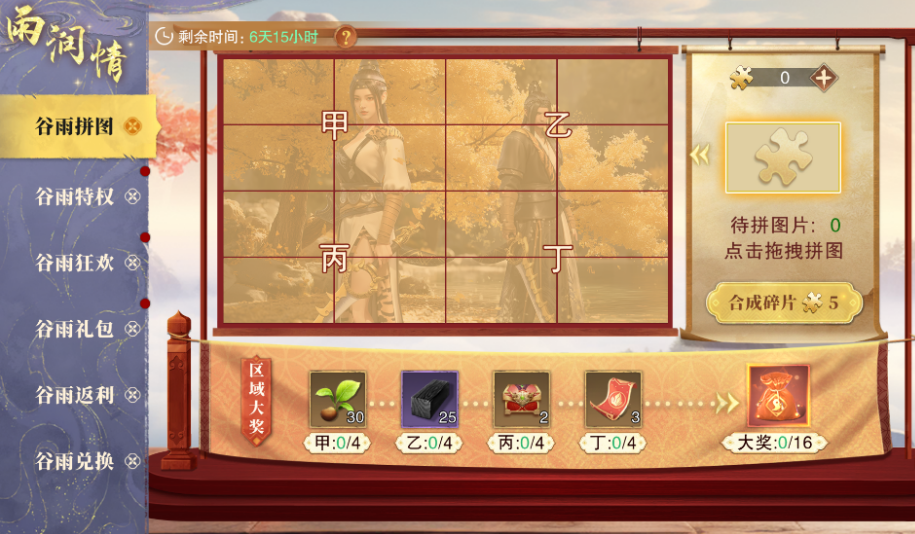 首先要介绍的是谷雨拼图活动。活动期间,玩家可以通过参与江湖历练、装备秘境和万剑冢等副本,随机掉落拼图碎片。收集到一定数量的拼图碎片后,可以合成完整的拼图并激活不同区域。每激活一个区域,就能获得丰厚的奖励,全部激活后,还能解锁最终大奖。这个活动不仅考验玩家的探索和勤奋,还提供了极具吸引力的奖励,绝对值得每位大侠全力参与。