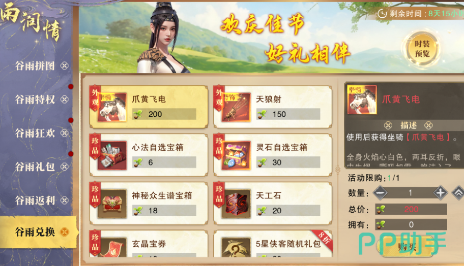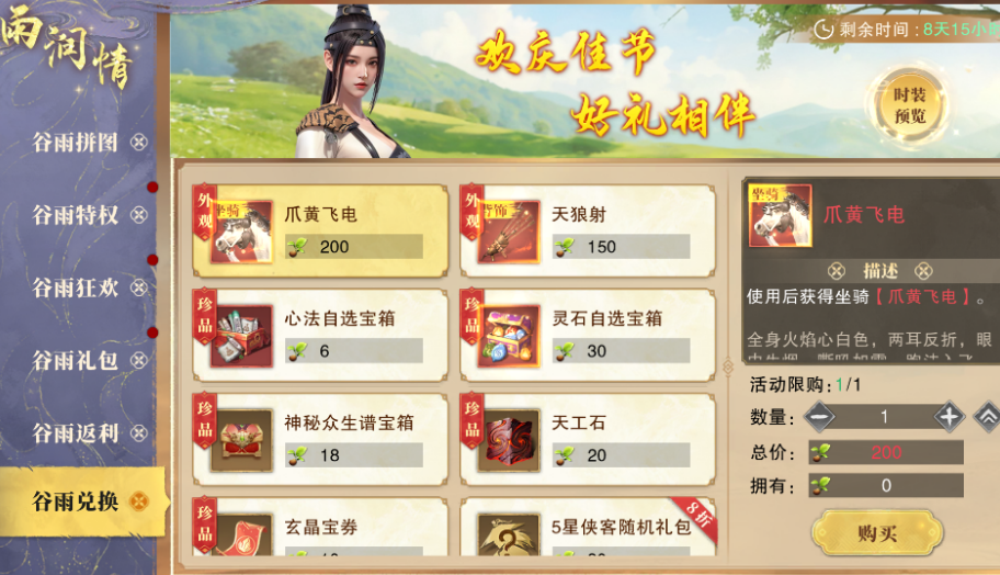 最后,谷雨兑换活动则让玩家能够通过青木芽兑换绝版背饰“天狼射”和限量坐骑“爪黄飞电”。这些珍稀物品不仅提升角色的外观,还能让你在江湖中更加独特,成为引领风潮的存在。