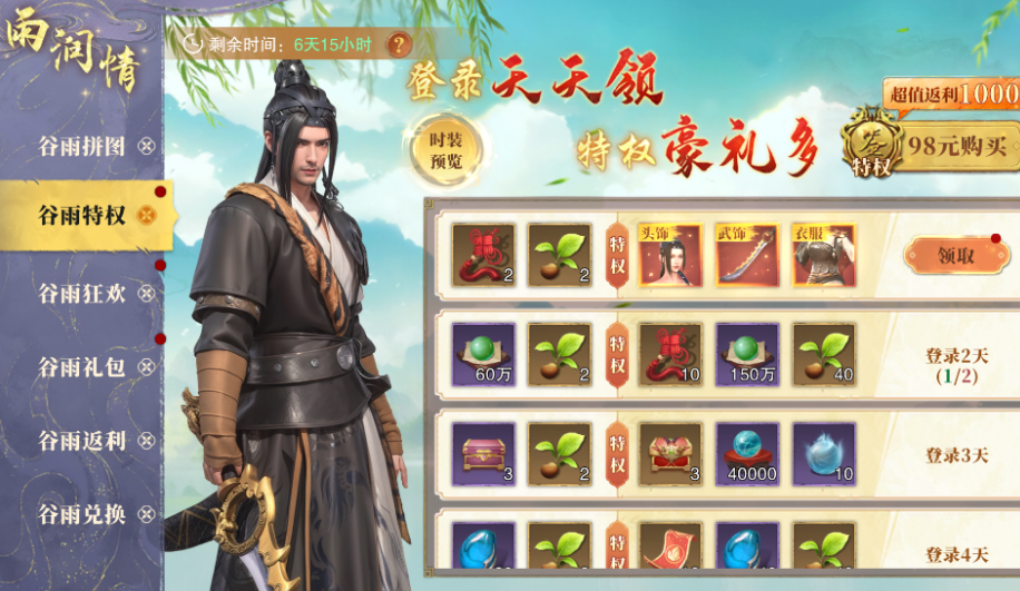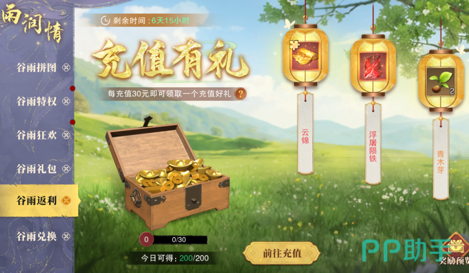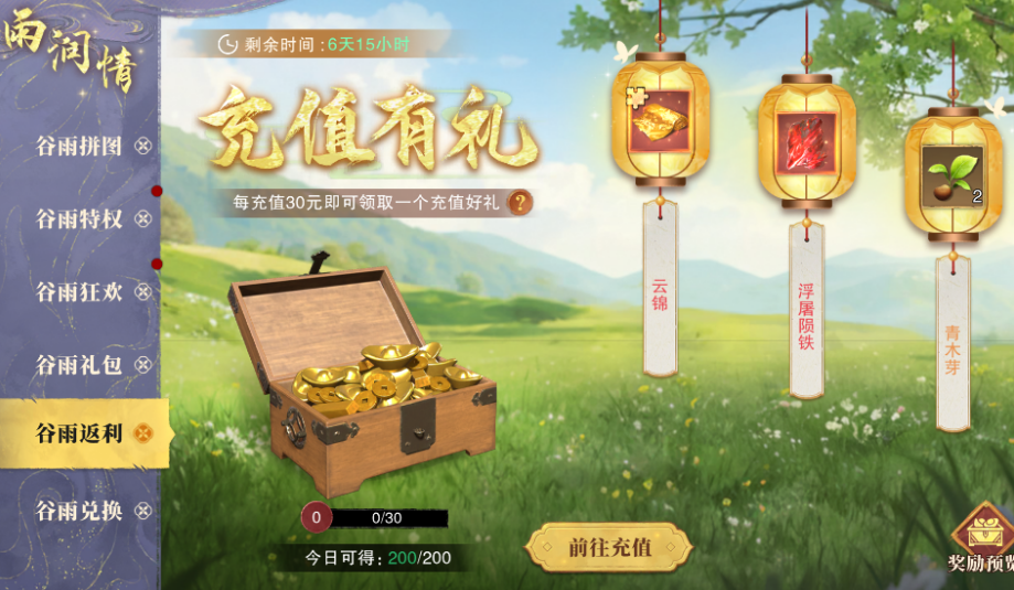 谷雨返利活动也不容错过。每当充值满30元,即可开启一次谷雨返利宝箱,宝箱内有机会开出云锦、浮屠陨铁、青木芽等珍贵材料。这些材料对于提升装备和培养角色非常重要,是每位玩家在活动期间不可忽视的福利。