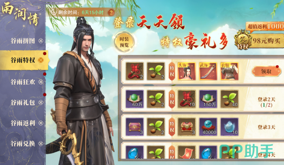接下来的谷雨特权活动,玩家在活动期间登录游戏即可领取免费春日特权。除此之外,付费购买特权的玩家,还能获得更多的豪华奖励,包括限时绝版时装“捉刀人系列”——包括“捉刀人·头饰”、“捉刀人·武器”以及“捉刀人·长袍”。这些独特的装备不仅让你的角色外观更加出众,还能提升你的整体气质,成为江湖中最亮眼的存在。