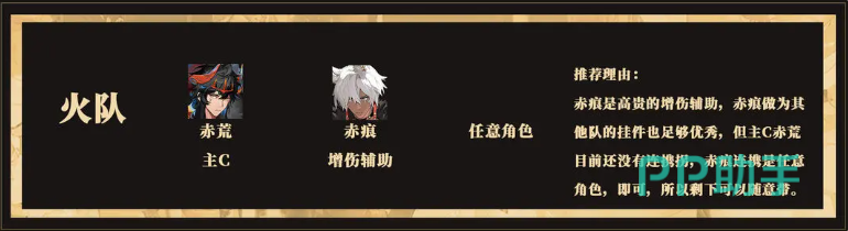 最后推荐的是火属性阵容,其中赤荒与赤痕为固定核心成员。赤荒作为主输出角色,拥有强大的爆发潜力;赤痕则专注于提供真实伤害辅助及增伤效果。尽管目前赤荒尚无专属连携搭档,但赤痕的连携效果可与任意角色触发,适用范围广泛。虽然跨属性连携的增益数值低于同属性组合,但在自由位上仍可灵活配置各类辅助角色,无论是增益类还是回复类,均可融入该体系,确保阵容多样性与适应性。