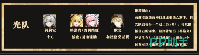 若倾向于光属性阵容,则可考虑莉莉安、格洛克与欧文的搭配方案。莉莉安作为主C,具备优秀的格挡反击机制,非常适合新手操作;格洛克则为其提供团队增益支持,强化整体作战能力;欧文与格洛克之间存在良好联动,可进一步优化资源分配。值得注意的是,当前光队缺少第二名冠2角色,因此最后一个位置可根据实际需要选择输出型或生存型角色。例如替换格洛克为奥利维娅,可大幅提升队伍恢复能力;而欧文虽前期易获取,但后期替代性强,可根据连携需求更换为其他能与莉莉安配合的角色。