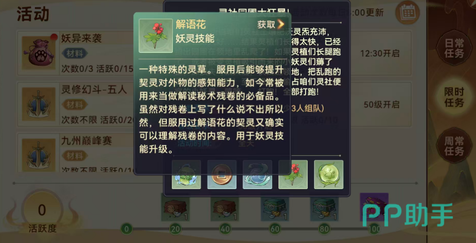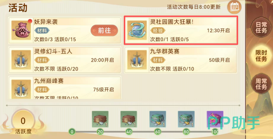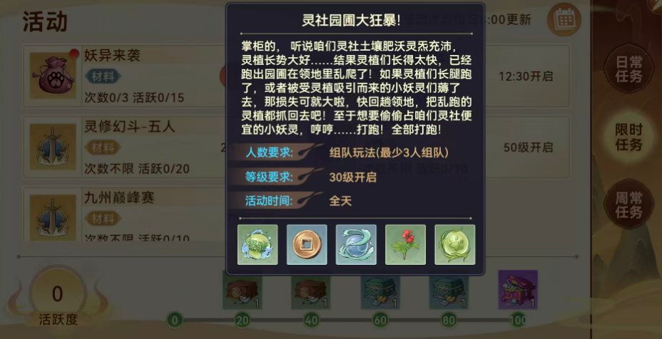《妖错图》中有一项高频开放的限时玩法——“灵社园圃大狂暴”,不同于常规活动的不定期开启,该玩法每日固定于12:30准时开放,具备强时效性与稳定参与节奏。玩家每日仅有一次进入资格,完成挑战后可获得5点活跃度奖励,是日常资源积累的重要途径之一。