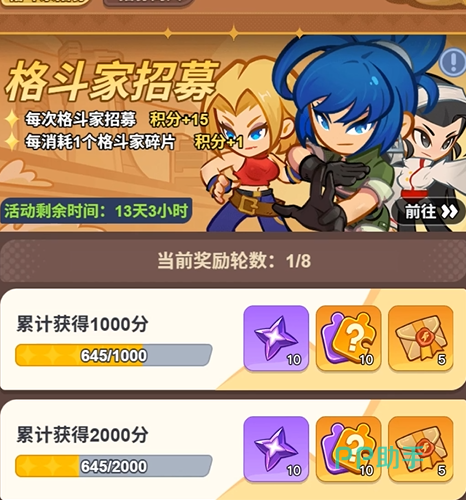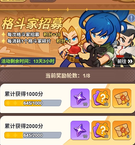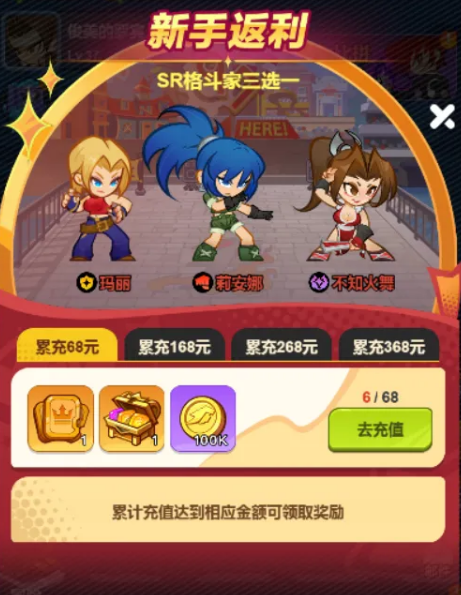新手返利活动是前期角色获取的关键路径之一。累计充值达68元、168元、268元、368元时,分别可领取1张、1张、2张、2张格斗家自选卡,总计6张。可选角色限定为玛丽、丽安娜、不知火舞。推荐优先选择玛丽(前排高生存+承伤能力)与不知火舞(后排高频爆发输出),搭配首充赠送的八神庵,即可构建起攻防均衡的基础阵容框架。