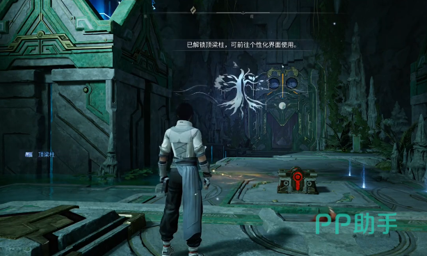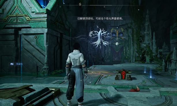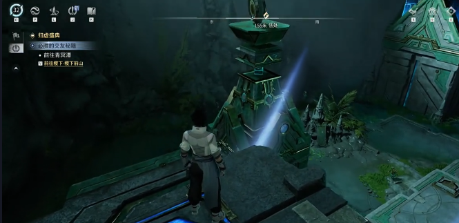 第二阶段谜题结构升级,但操作链路依然线性明确。首先进入开启后的门内,在后方墙体底部找到第三个压力机关,踩下后将激活一束新光束,需手动引导其垂直照射至后方独立石柱顶端;该操作将连锁触发第四机关。此时飞身跃上石柱顶部,踩下顶部机关,静待光束完成与远处反射装置的稳定对接。光路连通后,从柱子返回地面,再次使用冰冻果冻结河面,最后踩下柱体下方对应的地面机关——至此,第二重光学-物理双重验证谜题宣告完成。