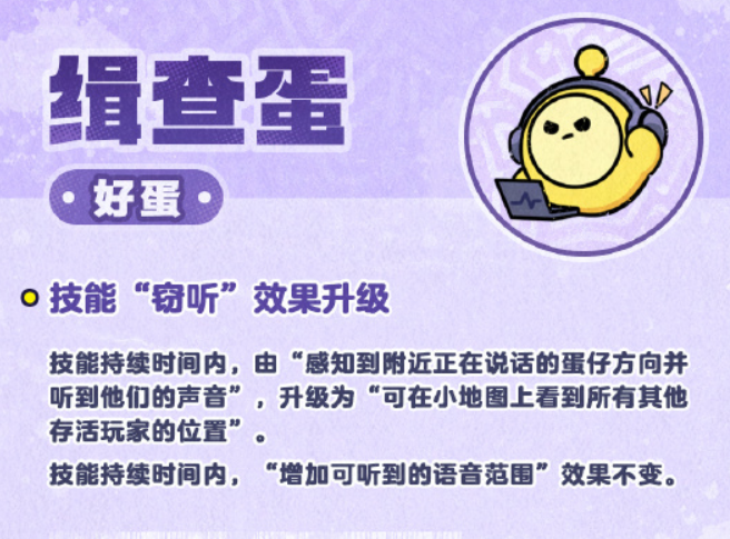缉查蛋的「窃听」技能完成机制重构:技能生效期间,除原有语音范围扩展功能外,新增全局存活玩家位置可视化能力,所有在线角色将实时显现在小地图上。双效叠加后,侦查覆盖半径与信息密度同步跃升,为团队提供更立体的局势感知基础,进一步巩固其在信息枢纽环节的核心定位。