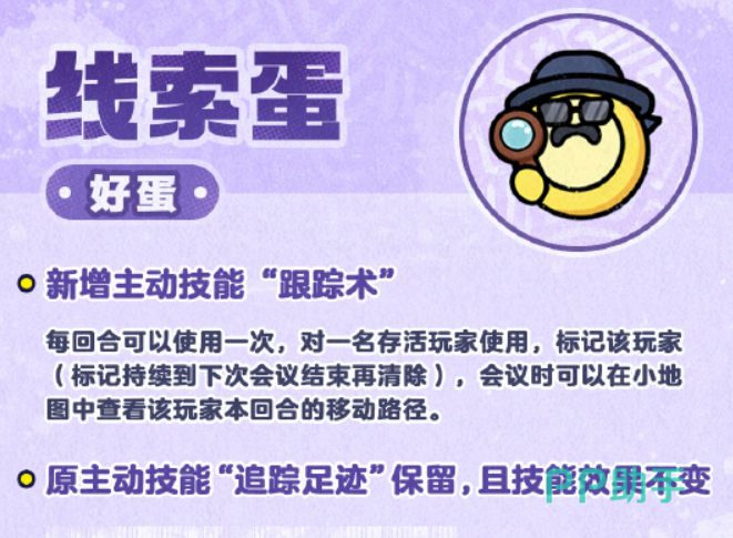 线索蛋获得全新主动技能「跟踪术」,每回合限用一次,可对任意存活玩家施加持续性标记,该标记效力延续至当轮会议结束。会议阶段,使用者可在小地图中完整回溯被标记目标本回合的移动轨迹。该机制有效压缩主观推断空间,使发言举证更具指向性,大幅强化好蛋阵营在逻辑链闭环中的主导能力。