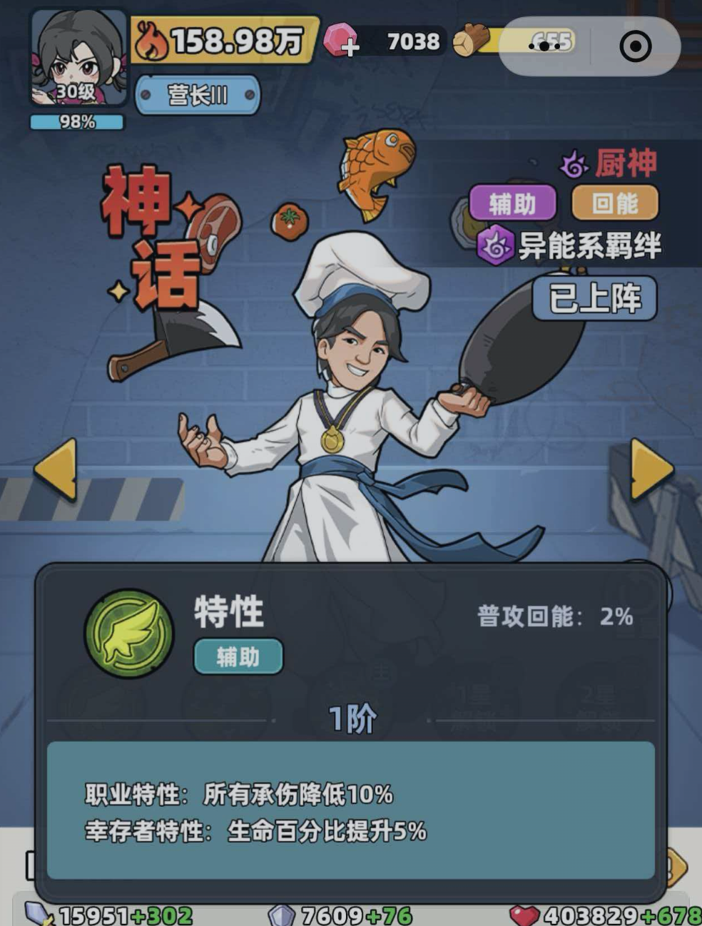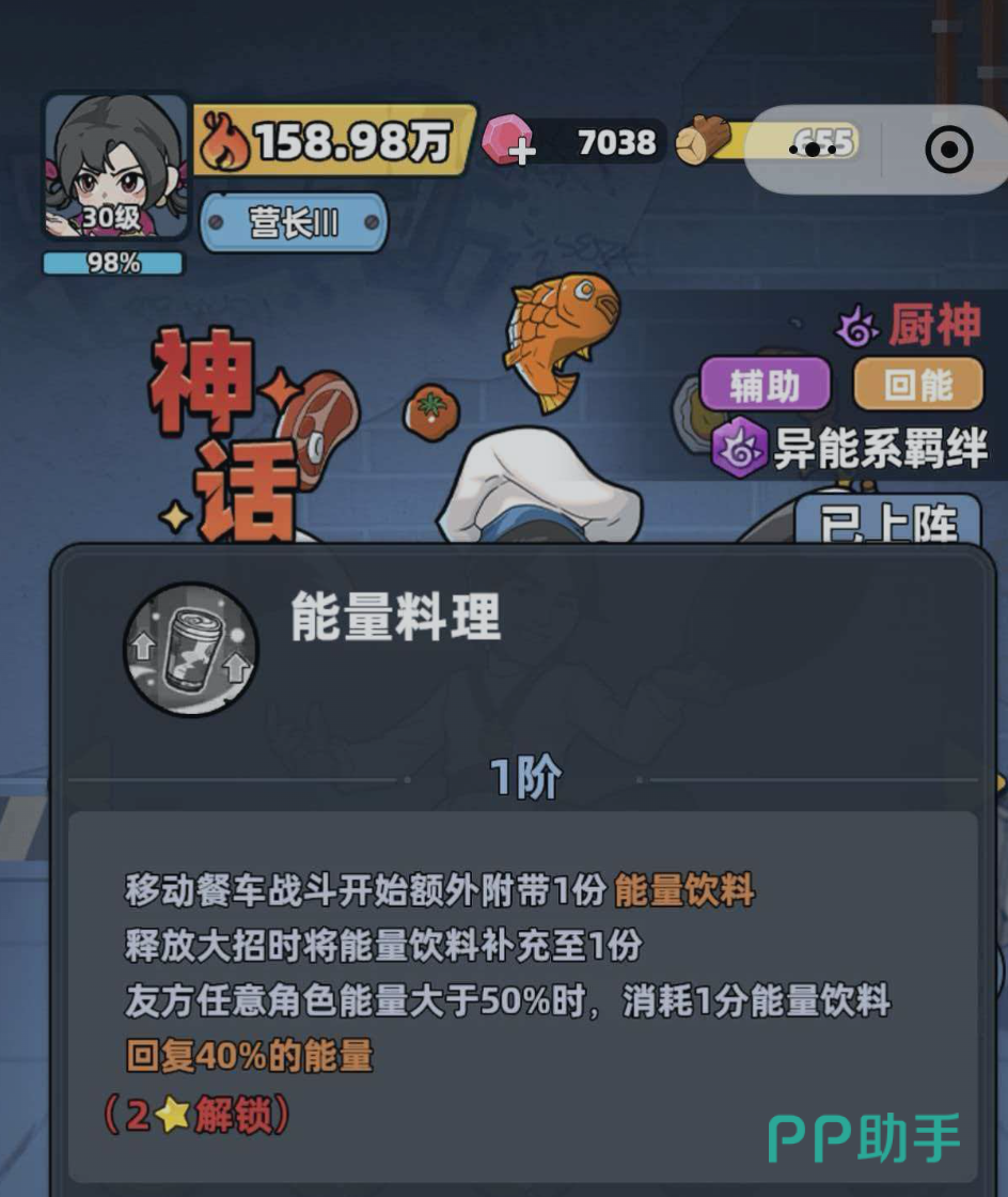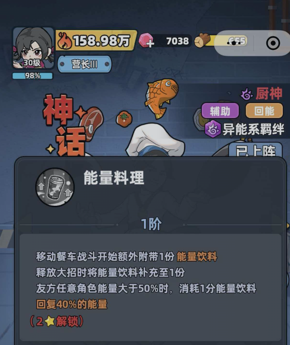 厨神的基础定位为高容错率的生存向辅助。其核心养成方向聚焦于“能量回复”与“生存强化”两项属性,同时天然具备异能系英雄身份。当队伍中配置两名及以上异能系角色时,即可激活对应羁绊效果;若进一步构建完整异能体系,全队综合战力将获得显著跃升。因此,理解厨神技能机制是实现阵容深度协同的前提。