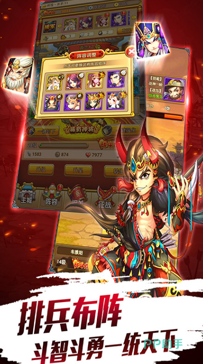 这是一款充满趣味的RPG即时战斗卡牌手游。它以Q版萌趣的画风和幽默风趣的战斗方式以及轻松休闲的放置养成玩法,将RPG和策略以及养成等多种元素巧妙融合,为玩家开启一段别具一格的三国之旅。游戏上手十分容易,还有50多位来自不同阵营的武将,以及海量的道具,等待玩家精心搭配阵型与阵旗效果,引领他们踏上传奇之路。合理布置武将队伍,他们将自动为玩家作战。