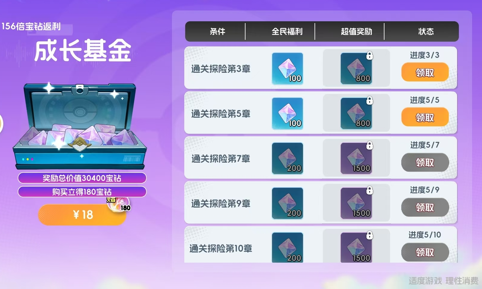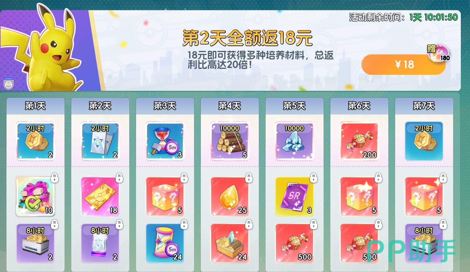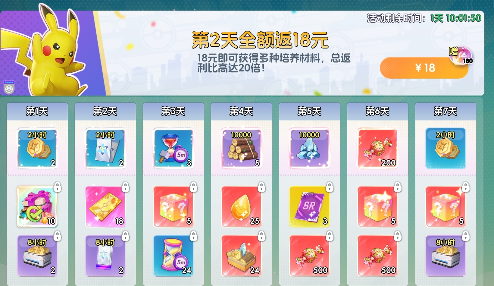 一次性支付18元,可获得多类养成材料,且全额以代币形式返还,无沉没成本,属新手友好型低风险投入项目。