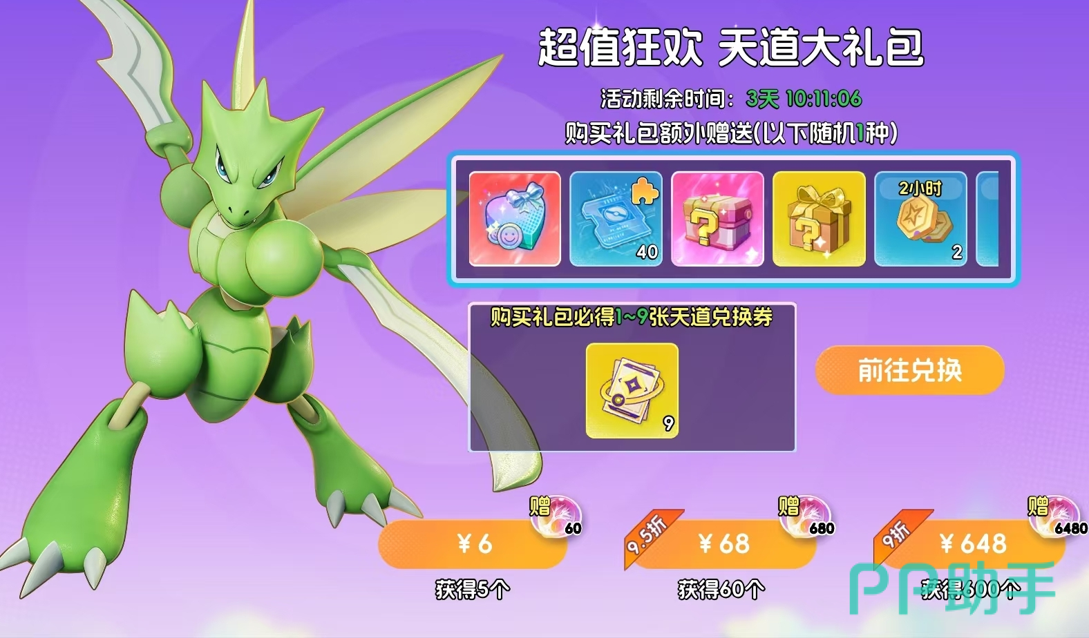 提供主城外观自选箱、随机藏品碎片、食物箱等装饰与功能道具,每单额外赠送1~9张天道兑换券。档位分为6元(5个礼包)、68元(60个礼包)、648元(600个礼包)。所获兑换券可在天道商店中兑换SP宝可梦自选卡、SSR宝可梦自选卡等关键资源,是解决升阶材料缺口的有效路径。