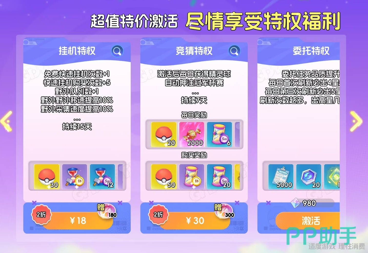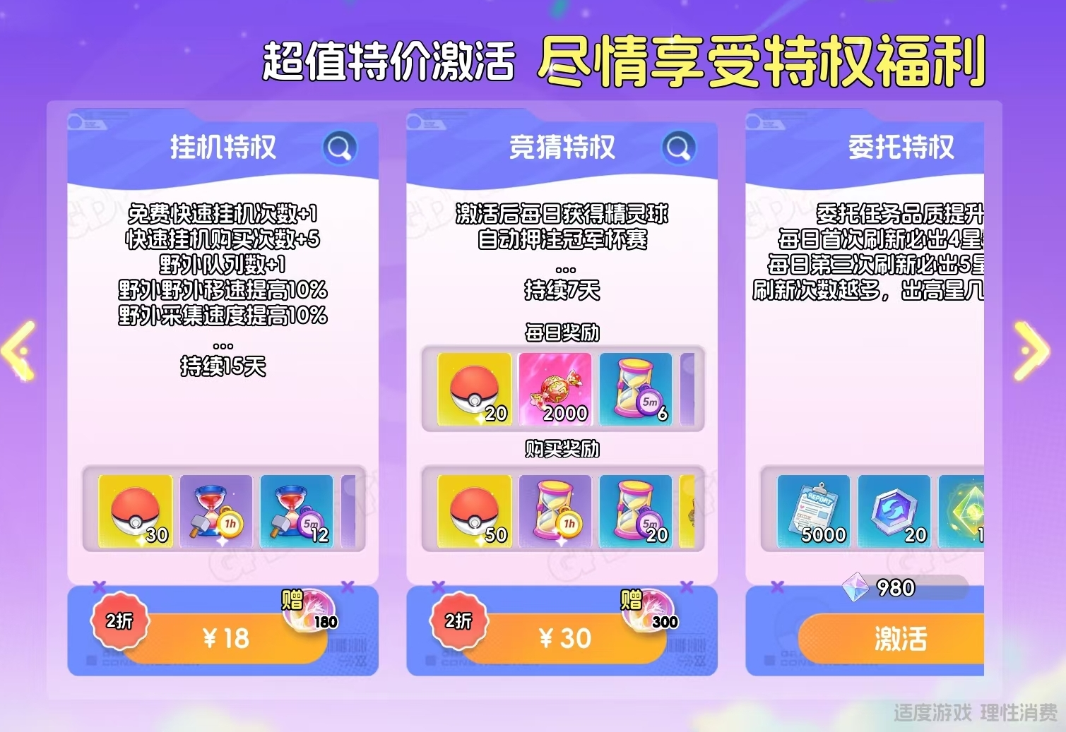 召唤特权(首充激活)、挂机特权(18元)、竞猜特权(30元)、委托特权(980宝钻),激活后同步解锁对应功能权限及专属激活礼包。按实用强度排序:召唤特权>委托特权>挂机特权>竞猜特权。