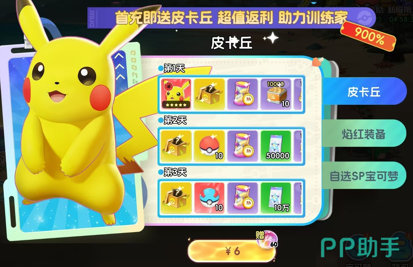游戏初期开放6元、30元、128元三档首充选项,奖励分3日逐次发放。其中6元档为最低门槛,适合预算有限的新手;30元档补充强化资源,适配中长期养成节奏;128元档含SP宝可梦自选资格,是进阶玩家快速组建核心阵容的关键入口。