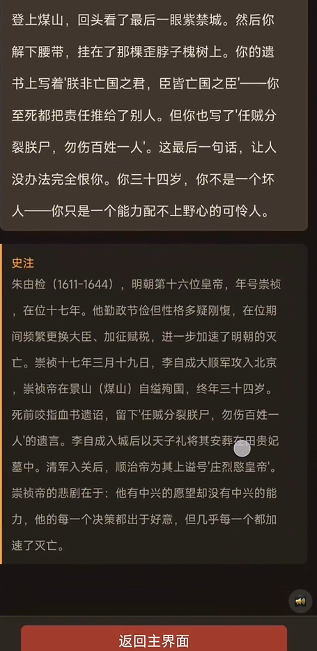 游戏采用“百年轮回”叙事结构,开局即可从数十位真实历史人物中任选其一,涵盖帝王将相、士绅商贾、流民义军、边镇戍卒等多元身份。每位角色均拥有独立时间线与命运轨迹,跨度横跨万历四十六年至顺治元年(公元1618–1644年),完整覆盖明末社会崩解全过程。每一次角色切换,即开启全新人生剧本:或执掌朝纲运筹帷幄,或躬耕陇亩挣扎求存,或揭竿而起改写秩序——所有路径皆由玩家在关键节点的选择实时驱动。