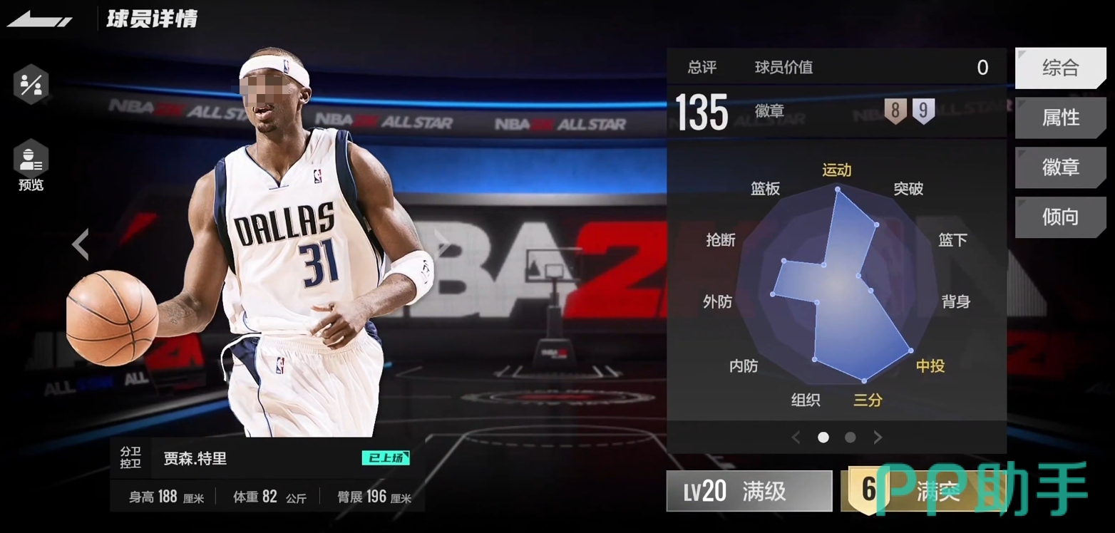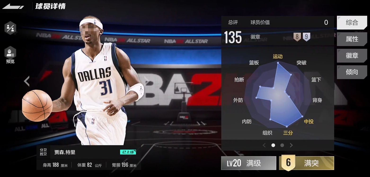 一般来说历史类型的球员相较于新秀球员,往往拥有更为出色的属性和更多的徽章,贾森特里也不例外,他在场上的位置是得分后卫和控球后卫,从身体条件来看,身高188厘米,体重82公斤,臂展196厘米,这样的身材在篮球场上属于小个子球员,但也正因如此,他在场上展现出了极为灵活的身手,通过雷达图可以清晰地看出,他的运动、中投、三分这三项属性都接近满值,这是他在进攻端的核心竞争力。