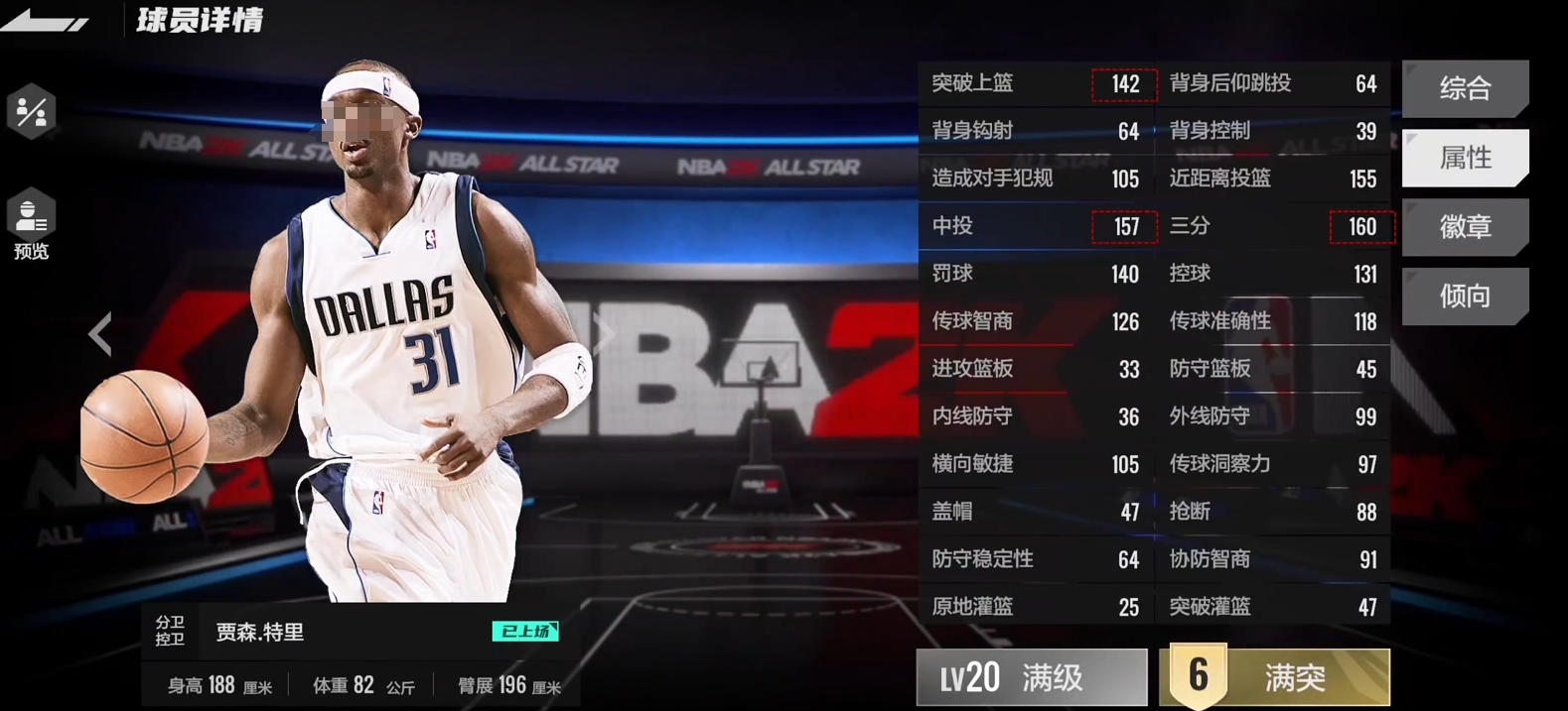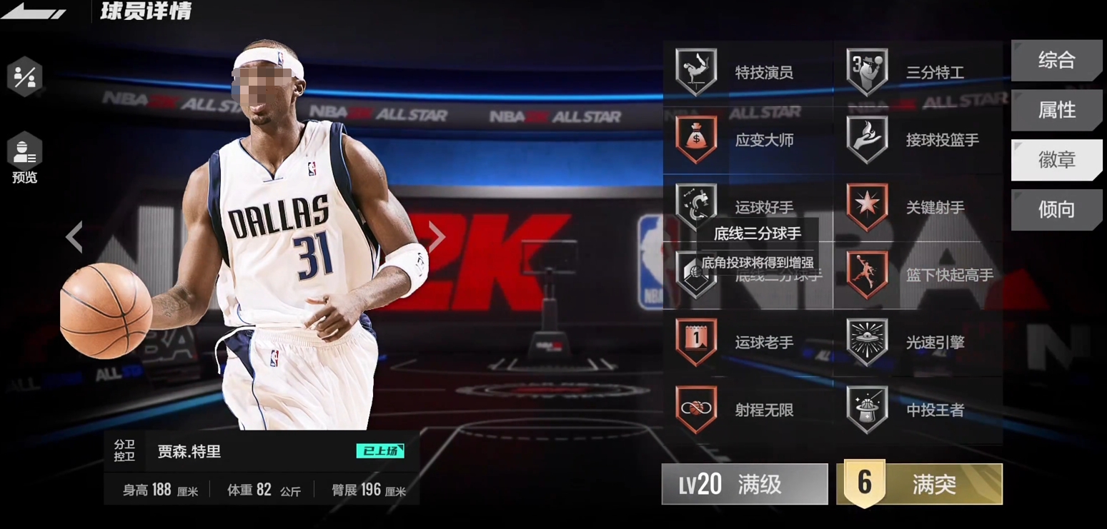 而36的内防属性更是几乎可以忽略不计,在内线防守上,他很难对对手的高大中锋形成有效的限制,不过这也可以理解,毕竟他的主要价值在于将进攻能力拉满,贾森特里在徽章方面也有不少亮点,他的徽章进一步加成了他的进攻能力,例如一些与三分球相关的徽章,让他在三分线外的威胁更加恐怖,这些徽章的存在,使得他在进攻端的手段更加丰富。