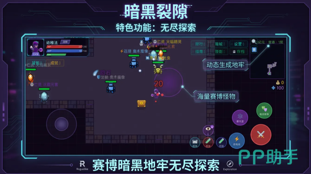 热爱暗黑风格与高难度地牢探索的玩家,不妨体验《暗黑裂隙》这款像素风Roguelike手游。游戏构建了一个融合哥特美学与近未来科技感的异界地牢世界——阴森的石壁、跳动的幽蓝能量回路、扭曲的空间裂隙共同营造出沉浸式暗黑氛围。进入场景后,玩家将置身于程序生成的随机地图中,每一步都可能触发未知遭遇,每一次转角都潜伏着形态各异的敌对单位,生存压力与探索乐趣并存。