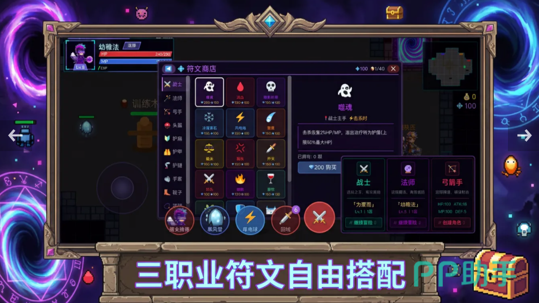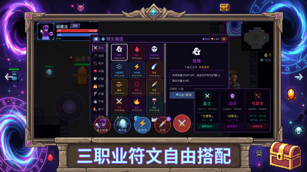开局可从战士、弓箭手、法师三大职业中择一而行:战士具备高基础生命值与格挡机制,适合新手建立操作信心;弓箭手拥有远程位移与多段爆发技能链,强调走位与节奏把控;法师则以元素属性伤害(如冰霜减速、雷电连锁)及范围控制为核心,考验资源管理与时机判断。角色成长过程中,技能树呈非线性展开,玩家可通过自由搭配主动技、被动技与符文系统,构筑差异化战斗流派。
