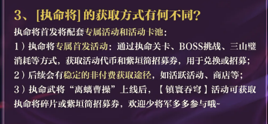 离螭曹操将于版本更新同步上线,获取途径包含多重活动支持:首发期间开放专属执命关卡、BOSS挑战及三山璧兑换,产出活动代币与紫垣简招募券,用于直接招募或定向兑换。后续还将开放日常活跃任务、限时商店等零氪友好渠道。同时,在镇寰吞穹活动中,玩家亦可稳定获取执命将碎片及紫垣简招募券。