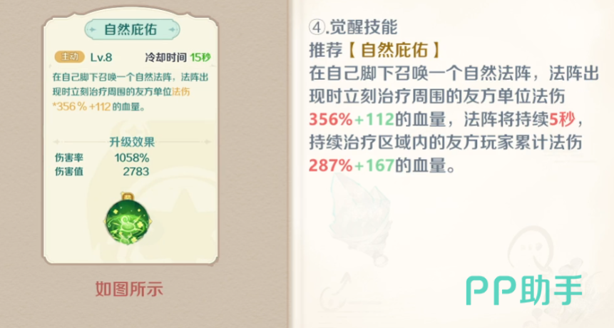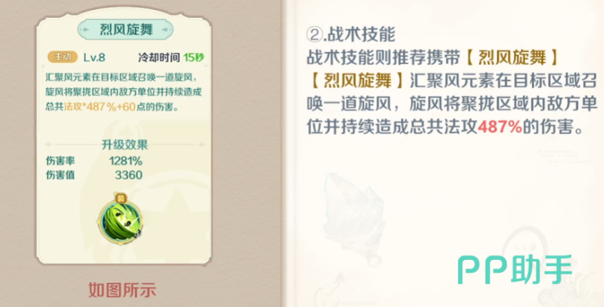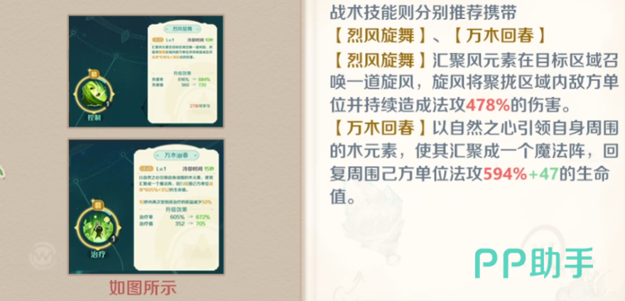 “万木回春”可在目标区域生成回复魔法阵,范围内所有友方单位持续获得总计594%比例的生命恢复效果,是群体续航的核心保障。若希望在治疗之余保留一定输出能力,可搭配“烈风玄武”作为补充技能。此技能召唤风元素形成旋风攻击,造成487%的法术伤害,属于远程AOE输出,虽不主打爆发,但能有效应对小规模敌人聚集的情况。