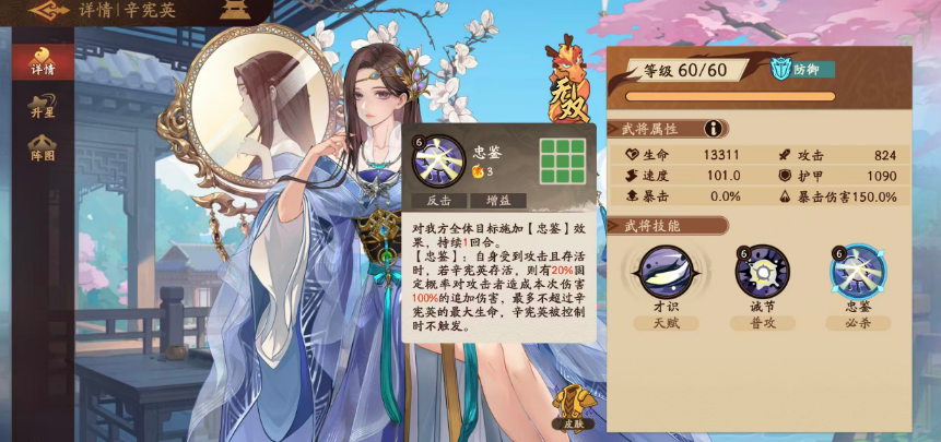 辛宪英的核心机制围绕“忠鉴”状态展开。该状态由其天赋【才识】触发,生效时可提升自身10%最大生命值。值得注意的是:1命阶段该效果持续时间较短,实战增益有限;但进入2命后,机制质变——当任意处于忠鉴状态的友方单位受到敌方攻击时,辛宪英有20%基础概率发动生命恢复,恢复量为本次所受伤害的30%;至4命时,忠鉴状态额外赋予目标15%最大生命加成;6命则实现完全质变:自身携带忠鉴状态下,受击必触发生命恢复,且反击概率提升至100%,形成“受击即反伤+回血”的双重反制链。
