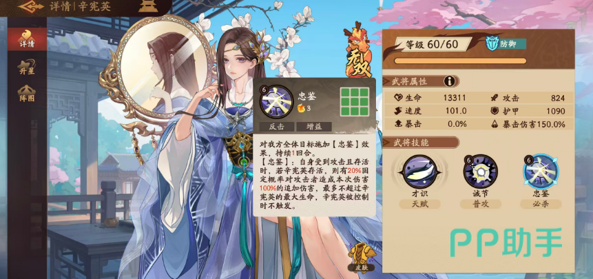 其必杀技兼具辅助与反制功能:在为我方施加忠鉴状态的同时,提升全体反击触发率。具体表现为——当辛宪英未被击杀并存活于战场时,每次承受敌方攻击均有20%固定概率发动反击,伤害等同于本次所受伤害数值(上限不超过其当前最大生命值)。需特别注意:该技能全程受控场类负面效果制约,一旦被沉默、禁言、眩晕等控制命中,反击与恢复类效果将无法激活,因此队伍配置中建议搭配解控或抗控辅助角色以保障其机制运转。