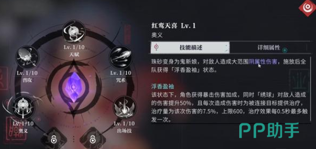 红鸾天喜:这一个技能就会让角色变成鬼新娘,可以针对敌人产生大范围的伤害,队友也可以得到暴击加成。并且绣球针对敌人也可以提升50%的伤害,每次在打出伤害之后,全部都会被链接目标受到治疗。