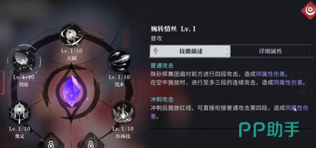 婉转情丝:属于一个普通攻击,可以挥舞手中的扇子,然后给前方造成将近四段的攻击,可以让敌方去承受阴属性伤害。空中释放就会持续三段连续的攻击,如果是进行冲刺攻击,那么在冲刺之后就可以释放一道红线,直接就可以连接普通攻击四段。